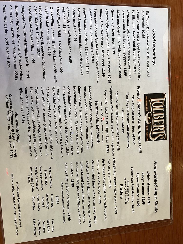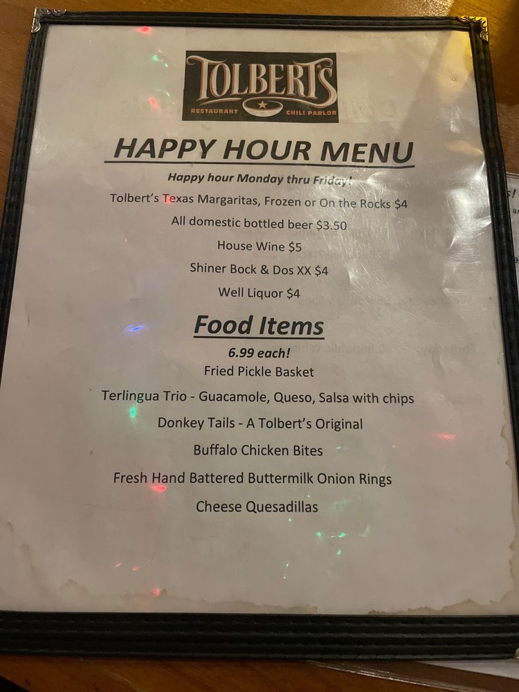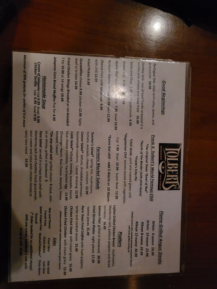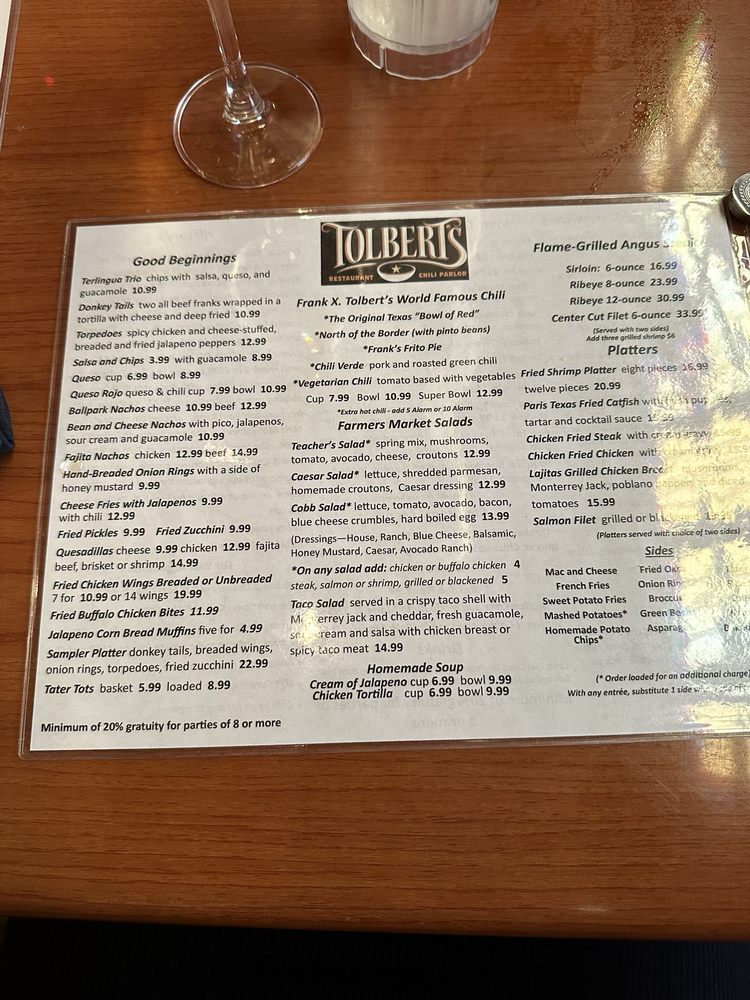 Introducing the menu at Tolbert's, a bar specializing in American cuisine. Located in Grapevine, TX, Tolbert's offers a variety of options for its customers, including reservations, delivery, takeout, and vegetarian choices. The restaurant also features live music events, with various performers showcasing their talent throughout the week. With a full bar, outdoor seating, and catering services available, Tolbert's provides a lively atmosphere for guests to enjoy. Customer reviews praise the delicious dishes, such as the chicken fried steak, chili enchiladas, and fried chicken sandwich. The friendly service and warm ambiance make Tolbert's a standout dining destination. Whether you're looking for a casual lunch or a night of entertainment, Tolbert's offers a diverse menu and a welcoming environment for all.