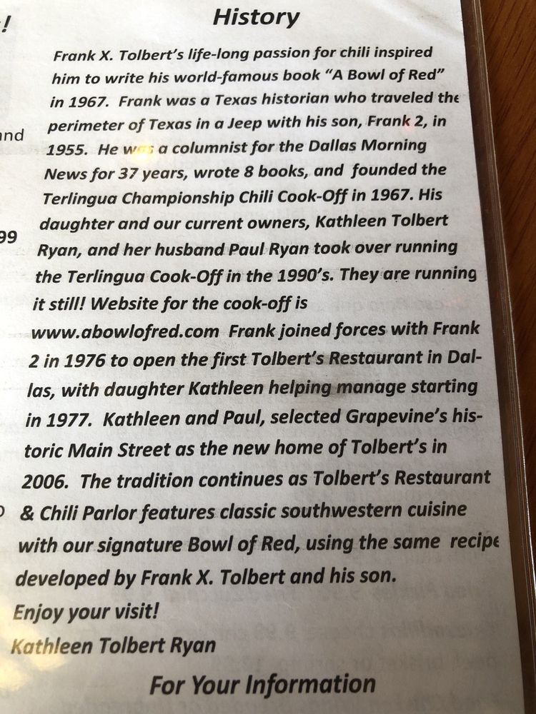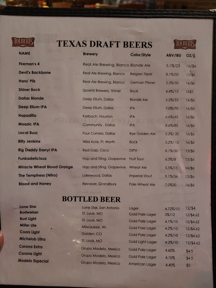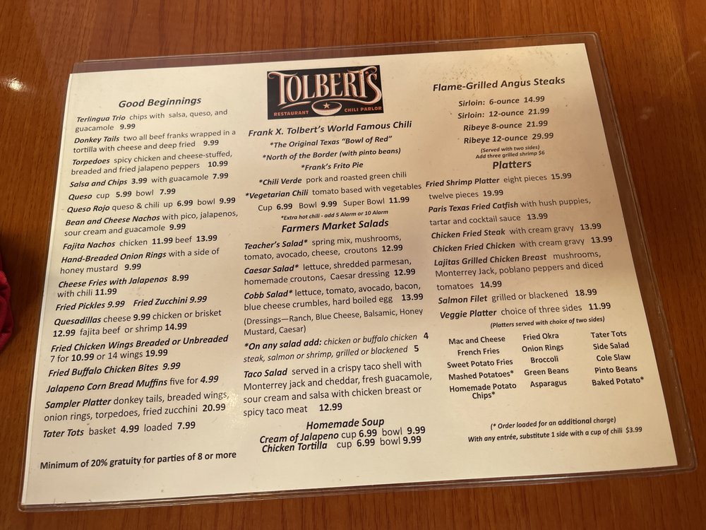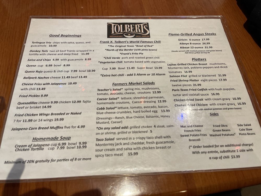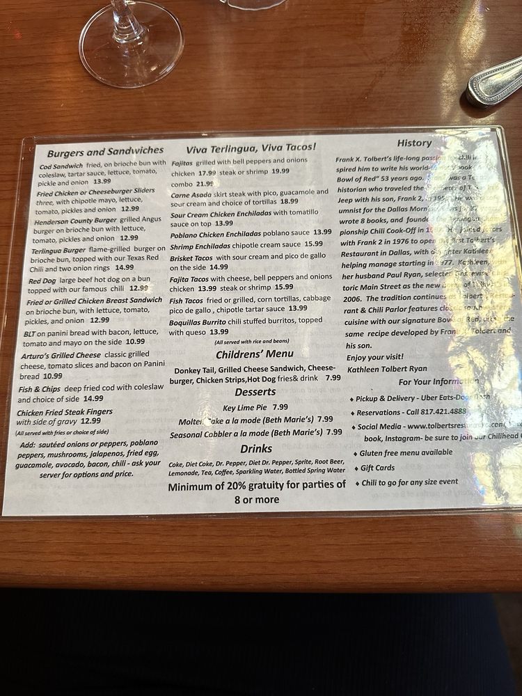 Introducing the menu at Tolbert's, a bar specializing in American cuisine. Located in Grapevine, TX, Tolbert's offers a variety of options for its customers, including reservations, delivery, takeout, and vegetarian choices. The restaurant also features live music events, with various performers showcasing their talent throughout the week. With a full bar, outdoor seating, and catering services available, Tolbert's provides a lively atmosphere for guests to enjoy. Customer reviews praise the delicious dishes, such as the chicken fried steak, chili enchiladas, and fried chicken sandwich. The friendly service and warm ambiance make Tolbert's a standout dining destination. Whether you're looking for a casual lunch or a night of entertainment, Tolbert's offers a diverse menu and a welcoming environment for all.